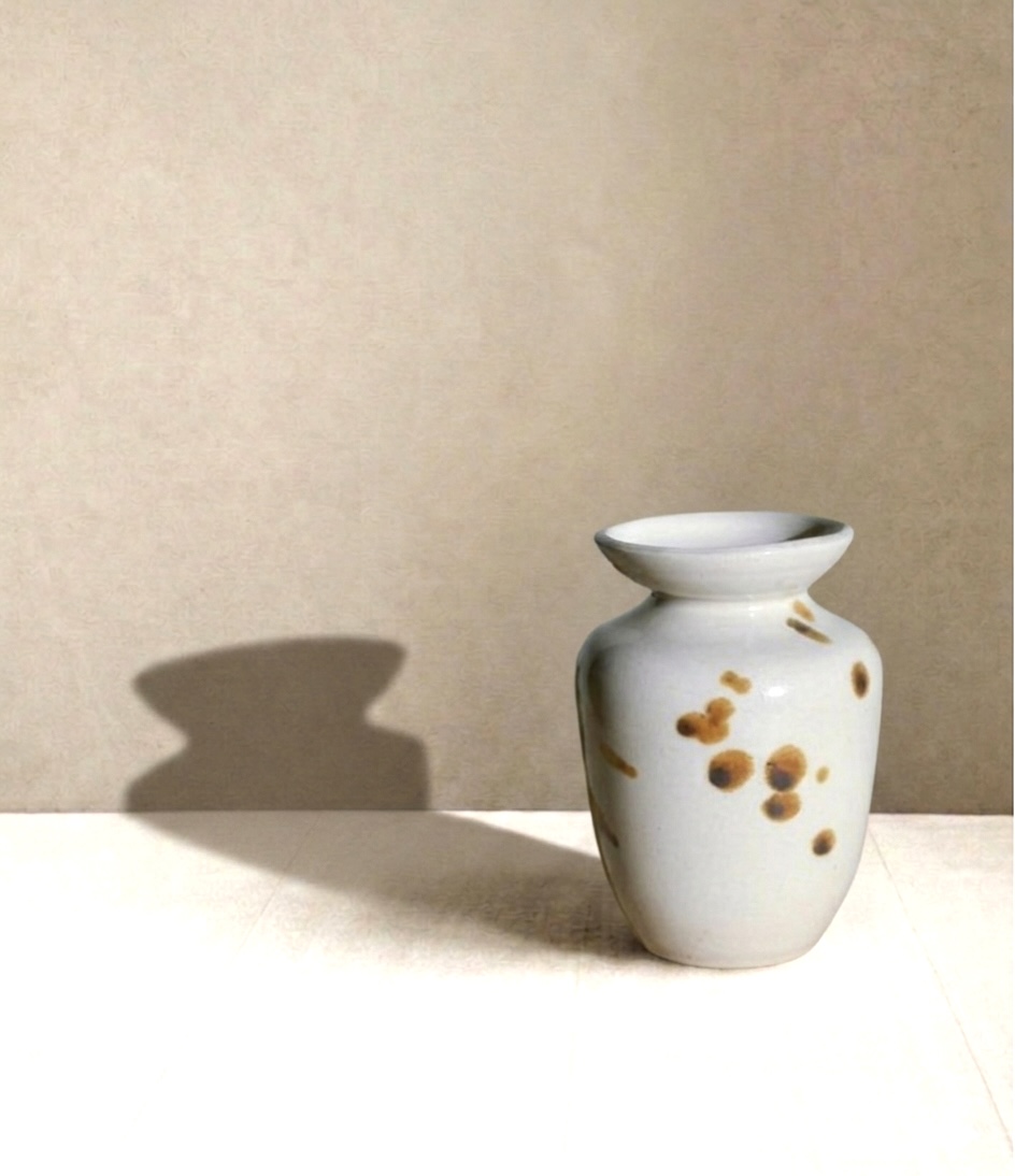 Glasyren Fröhus kombinerar ett rustikt och lekfullt uttryck med sin lena, blanka yta i kombination med de jordfärgade fläckarna. Den transparanta glasyren visar stolt upp den brutna, ofärgade leran. Vasen har en minimalistisk framtoning och ger ett modernt, skulpturalt uttryck som passar både i det lantliga hemmet och det mer moderna.