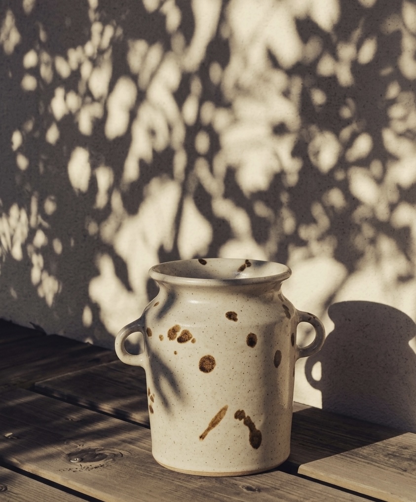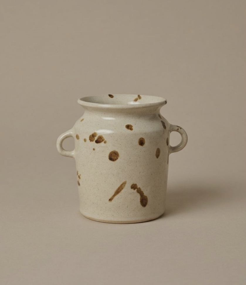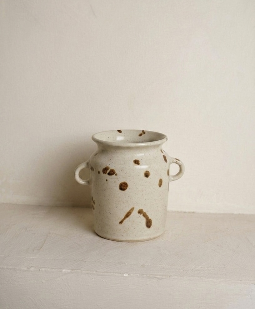 Glasyren Fröhus kombinerar ett rustikt och lekfullt uttryck med sin lena, blanka yta i kombination med de jordfärgade fläckarna. Den transparanta glasyren visar stolt upp den brutna, ofärgade leran. Krukan har en minimalistisk framtoning och ger ett skulpturalt uttryck som passar både i det lantliga hemmet och det mer moderna.