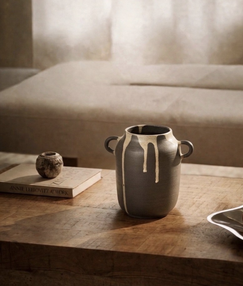 Den svarta, matta glasyren är diskret och smälter samman med den mörka leran.