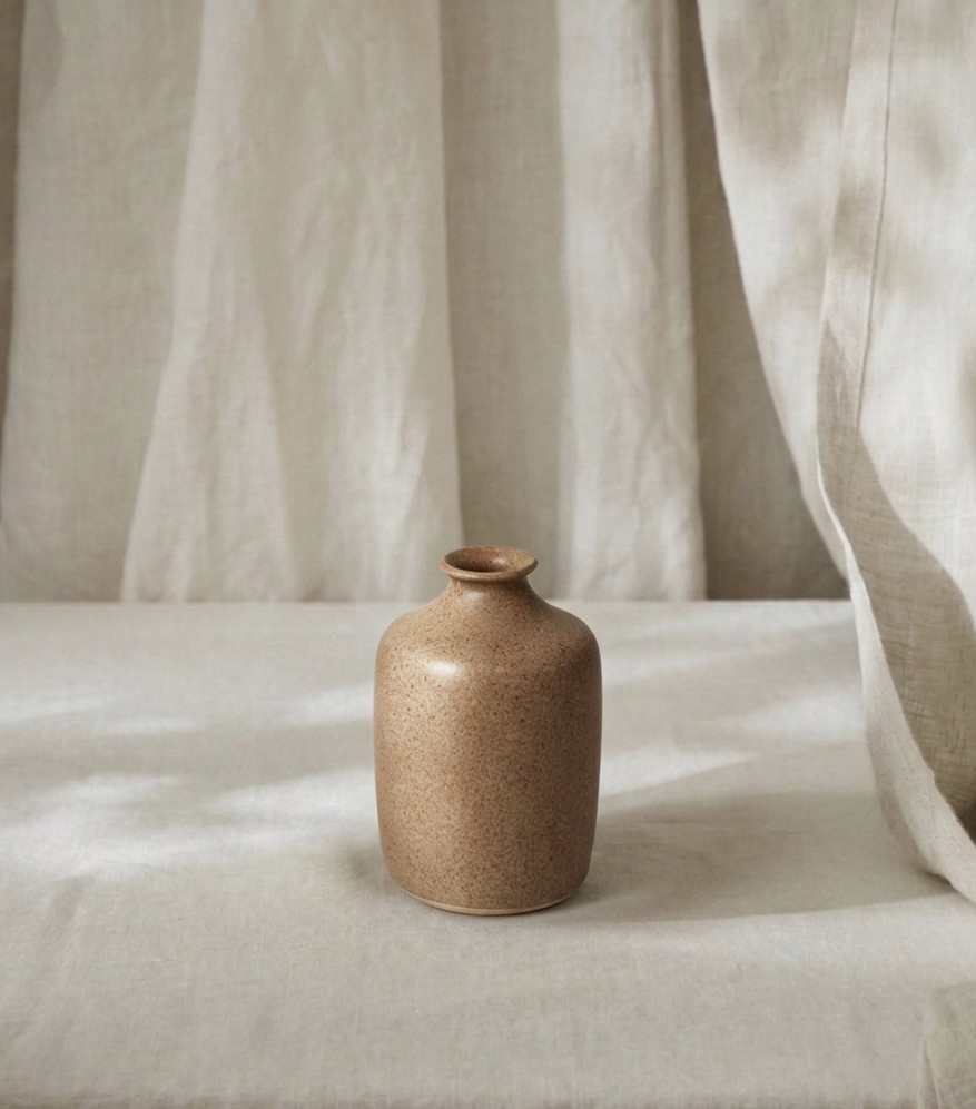 Glasyren Nougat är levande och varm, ljusbrun med en aning rosa brytning. Färgen är jordnära och halvmatt med varierade mörka stänk. Varje vas är en aning olik den andra och skapar tillsammans en vacker komposition på det dukade bordet. Kombinera gärna sticklingvasen i Nougat med med koppar och skålar från någon av de andra serierna.