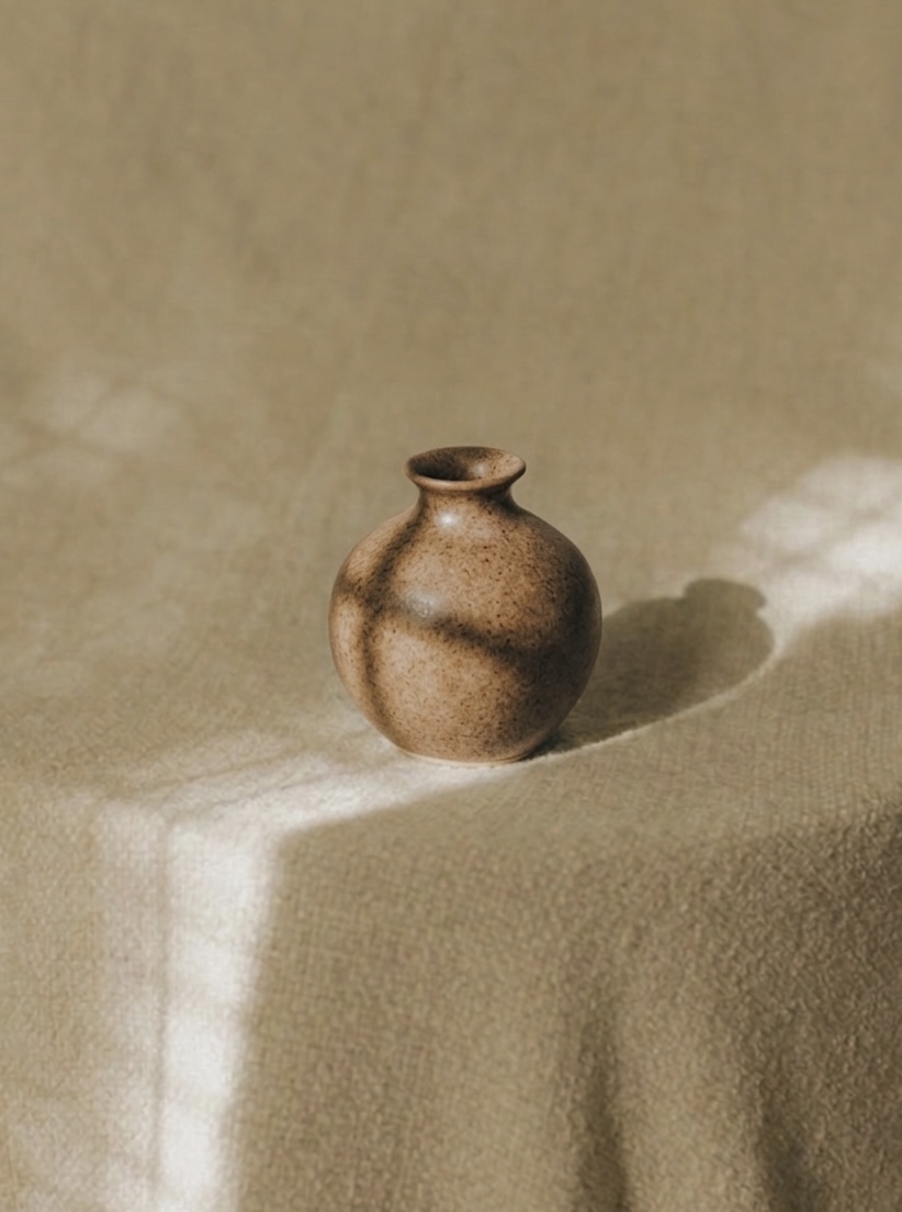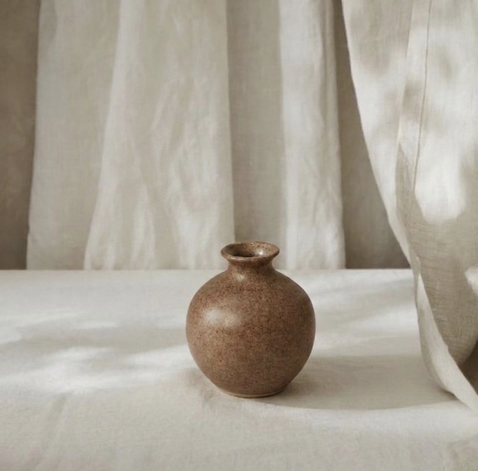 Glasyren Nougat är levande och varm, ljusbrun med en rosa brytning. Färgen är jordnära och halvmatt med varierade mörka stänk. Varje vas är en aning olik den andra och skapar tillsammans en vacker komposition på det dukade bordet. Kombinera gärna sticklingvasen i Nougat med med koppar och skålar från någon av de andra serierna.